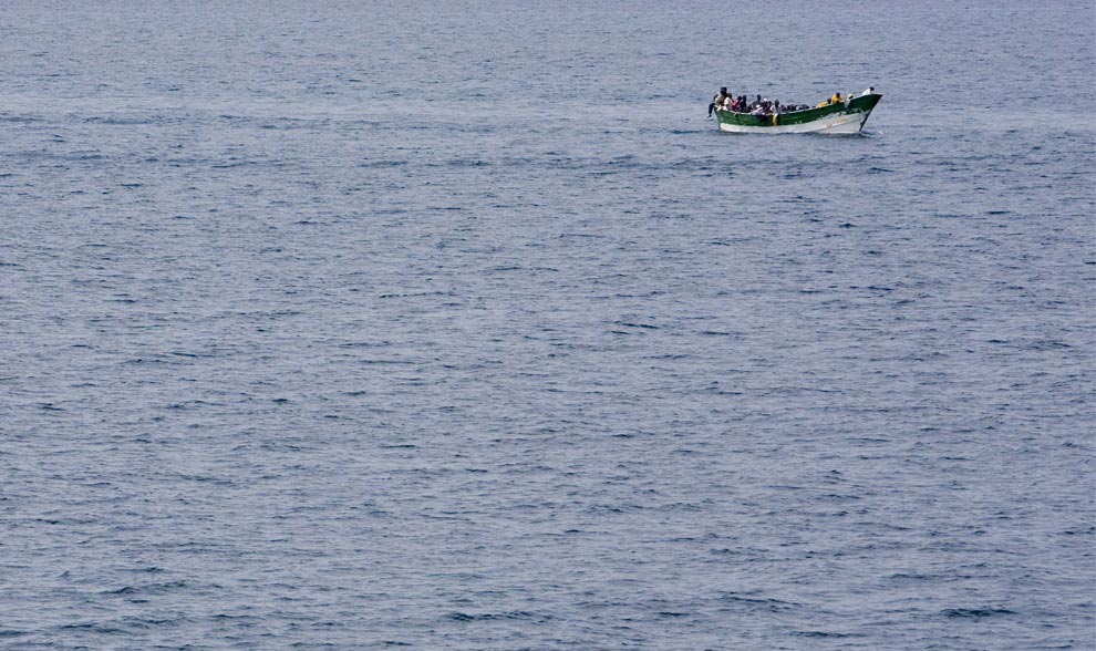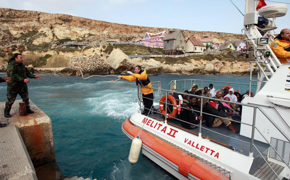 A small group of would-be immigrants wait on deck of a armed forces of Malta patrol boat after they were picked up two days ago by a merchant boat, some 59 miles of the south of Malta on January 11, 2009. 162 people were crammed into a boat just 10 metres (35 feet) long, included 28 women, one of whom was pregnant, and a child when rescued, and are the first to arrive in Malta this year - following the arrival of 139 migrants late last month. (BEN BORG CARDONA/AFP/Getty Images)