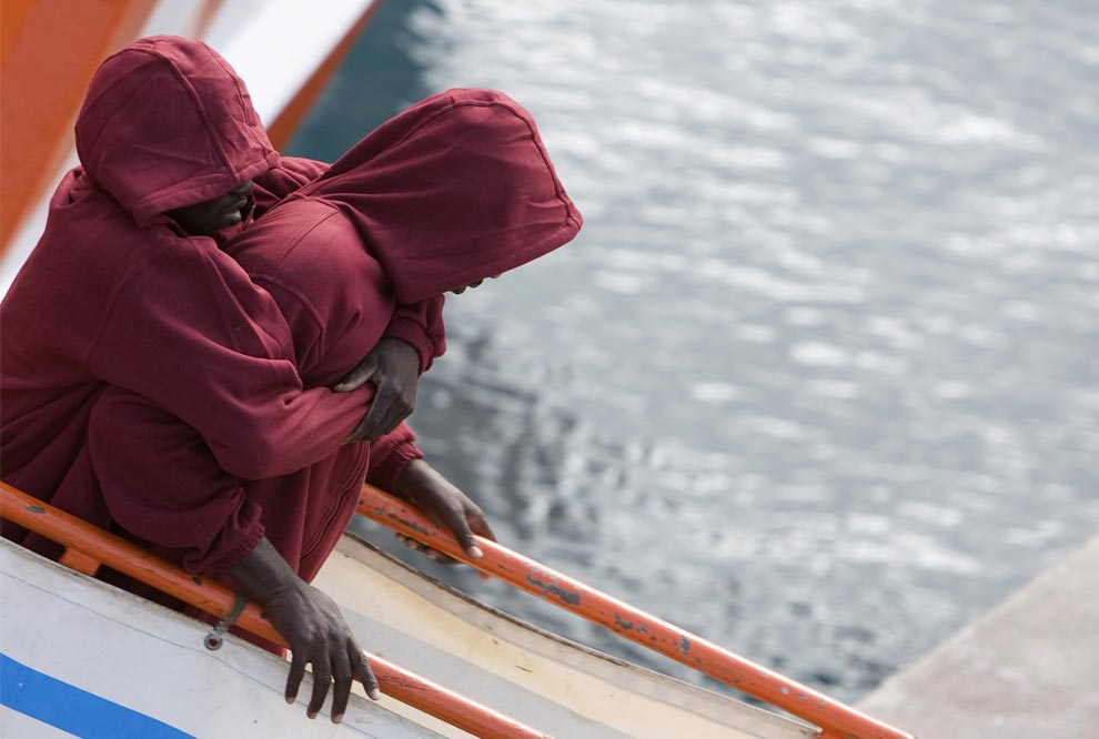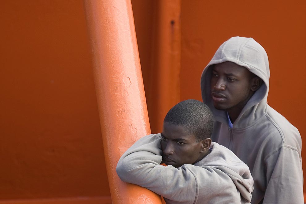 Two men arrive on board a rescue boat at the port of Los Cristianos on Spain's Canary island of Tenerife, October 17, 2008. They and 110 other would-be immigrants were intercepted aboard a make-shift boat on their way to Spain from Africa. (REUTERS/Santiago Ferrero)