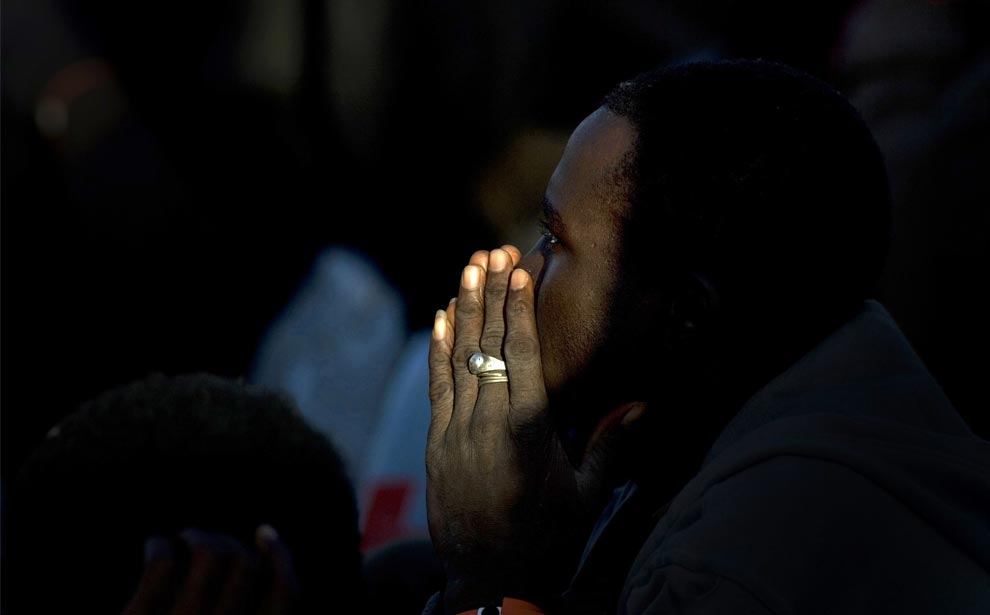 A would-be immigrant prays after being safely brought ashore from the motor tanker "Overseas Primar" by the Armed Forces of Malta at Anchor Bay on the northwest coast of Malta January 13, 2009. 161 would-be immigrants were rescued by the Marshall Islands-registered tanker on January 11 after finding themselves in difficulty while on their way to reach European soil from Africa, an army source said. (REUTERS/Darrin Zammit Lupi)