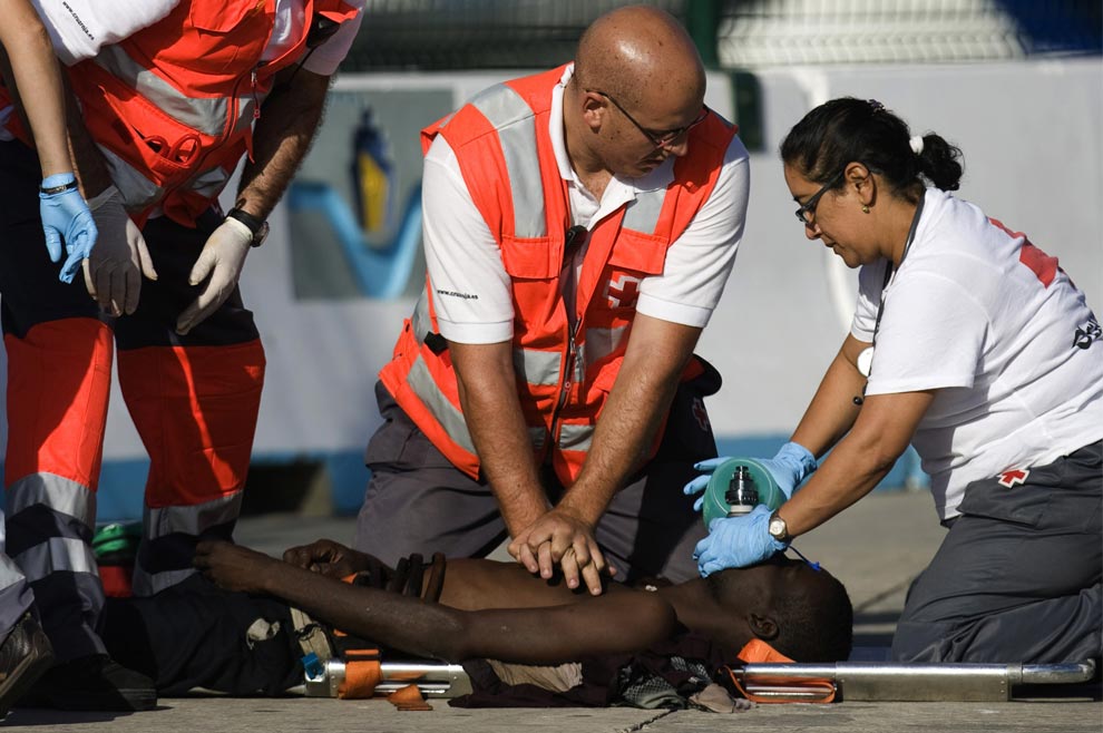 Medical workers attend to an immigrant after his arrival at the port of Los Cristianos on Spain's Canary island of Tenerife November 18, 2008. (REUTERS/Santiago Ferrero)