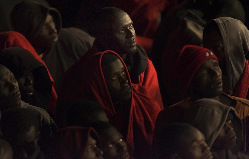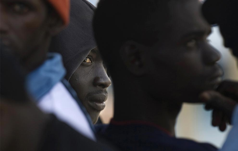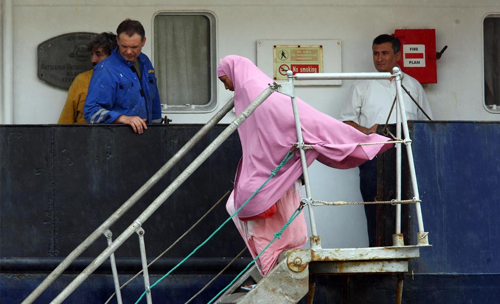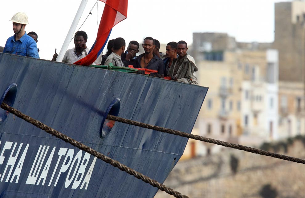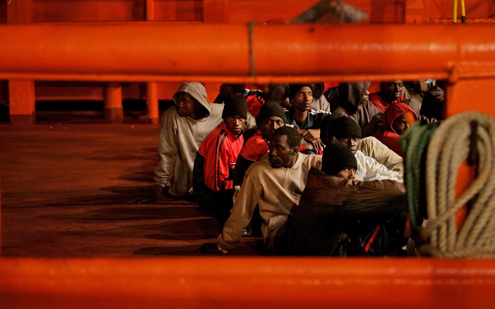 Migrants wait before disembarking from the Russian vessel Yelena Shatrova in Malta, on November 6, 2008. A boat load of 67 migrants including a pregnant woman in labour were rescued from a boat by a Russian registered bulkcarrier off the coast of Malta in poor weather conditions, Maltese officials said. (BEN BORG CARDONA/AFP/Getty Images)