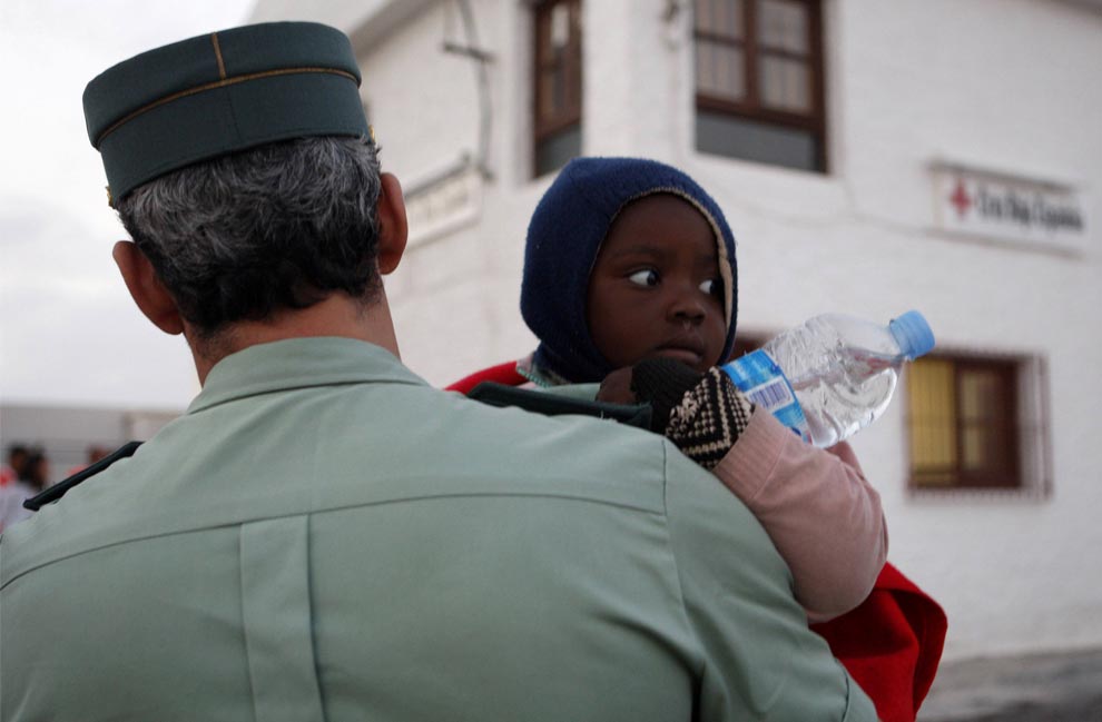 A member of Spanish Civil guard holds a baby after arriving at the port of Motril, southern Spain October 21, 2008, one of a party of 73 others aboard a fishing boat that was intercepted off the southern Spanish coast. (REUTERS/Pepe Marin)