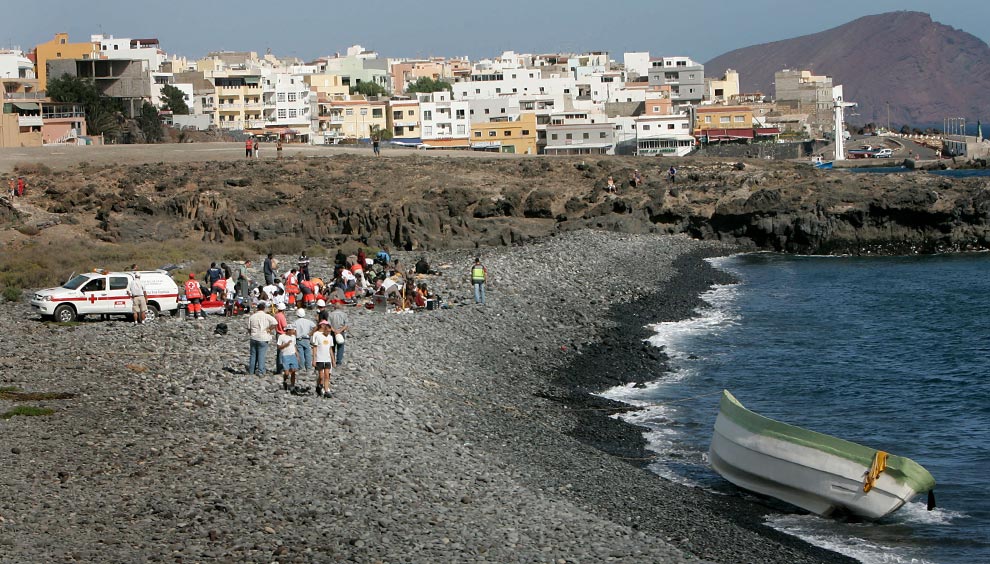 Tourists look at a group of 45 would-be immigrants, including 10 believed to be minors, being treated by Red Cross workers after their arrival at the port of San Miguel in Tenerife, Spain's Canary Islands, on November 13, 2008. (DESIREE MARTIN/AFP/Getty Images)