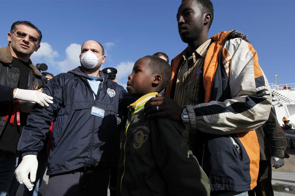 llegal immigrants walk towards a police bus after being brought ashore from the motor tanker "Overseas Primar" by the Armed Forces of Malta in Valletta's Grand Harbour January 14, 2009. The Marshall Islands-registered tanker rescued 162 migrants from a 10-metre boat 59 miles south of Malta after finding themselves in difficulty while on their way to reach European soil from Africa on January 11, but bad weather had since thwarted several attempts at the disembarkation of the migrants. (REUTERS/Darrin Zammit Lupi)