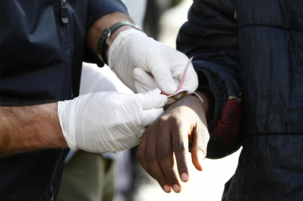 A migrant gets a plastic tag fitted on his wrist by a police officer after being brought ashore from the motor tanker