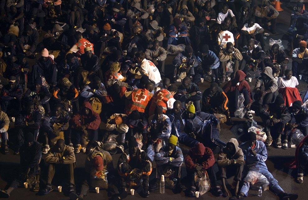 African immigrants rest and receive first aid after arriving at Los Cristianos port on Spain's Canary Island of Tenerife early September 30, 2008. Some 229 of them were rescued by Spanish rescue workers after being intercepted aboard a fishing boat adrift some 60 miles (96.5 km) offshore. (REUTERS/Santiago Ferrero)