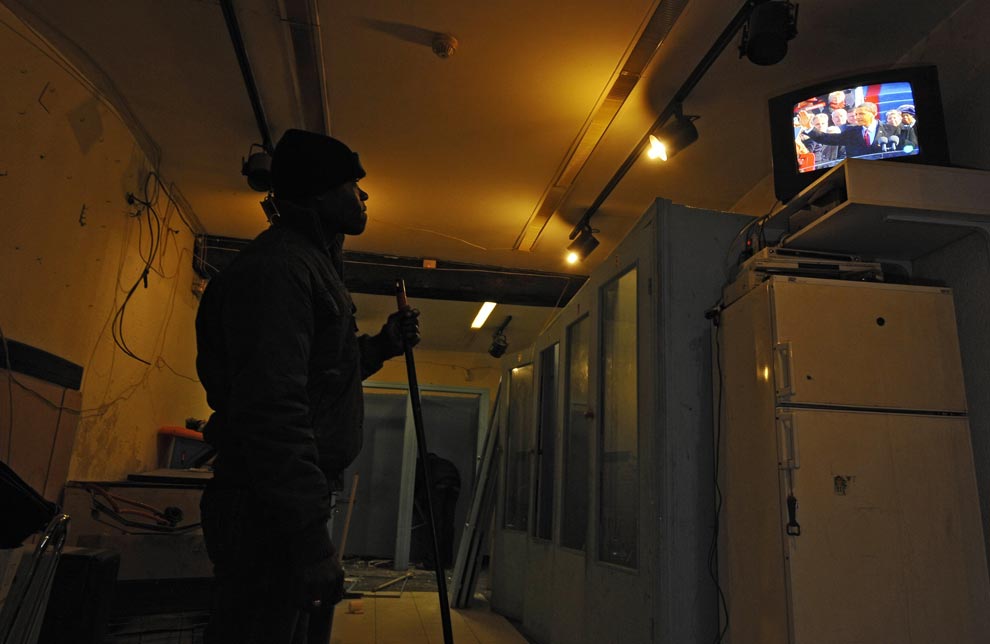 An unidentified immigrant from Nigeria looks at the TV in his store in Pamplona, northern Spain Tuesday Jan. 20, 2009 as President Barack Obama gives his inaugural address at the U.S. Capitol in Washington, Tuesday, Jan. 20, 2009. (AP Photo/Alvaro Barrientos)