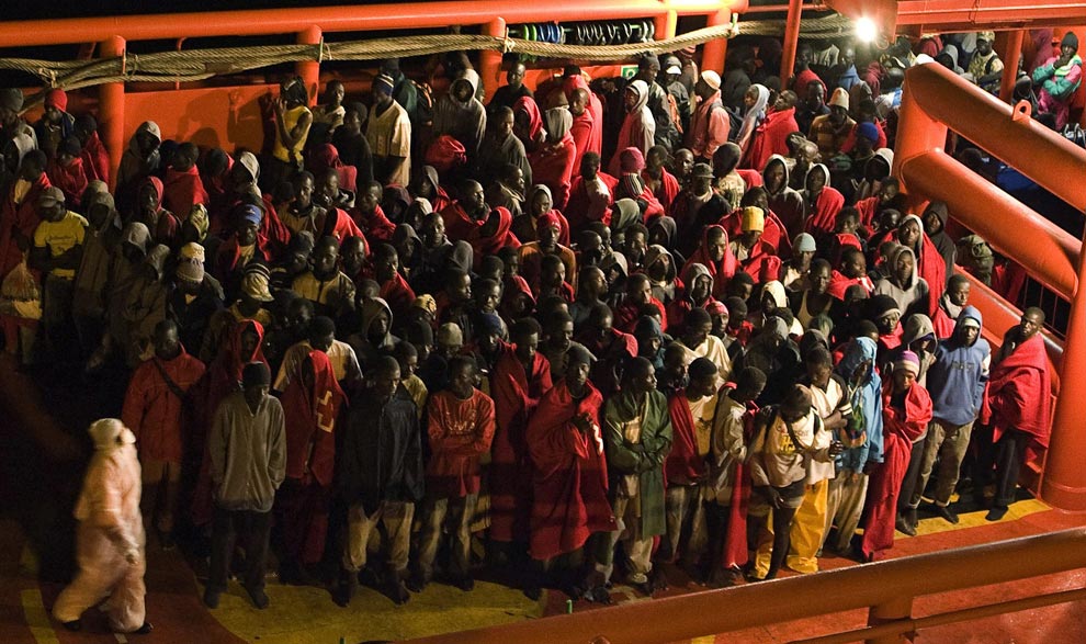 Some of 65 sub-saharian immigrants are pictured aboard the Marine Rescue boat "Puntas Salinas" upon its arrival in Los Cristianos on October 4, 2008, on the spanish Canary island of Tenerife. (DESIREE MARTIN/AFP/Getty Images)