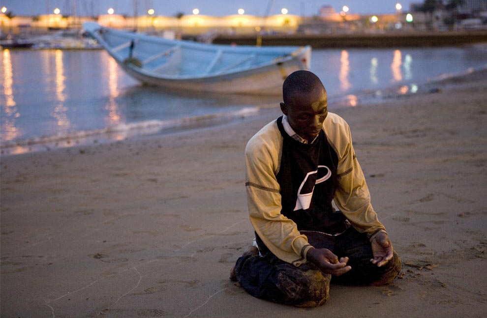 A would-be immigrant prays after arriving at the Puerto Rico beach on Spain's Canary island of Gran Canaria July 1, 2008. (REUTERS/Borja Suarez)