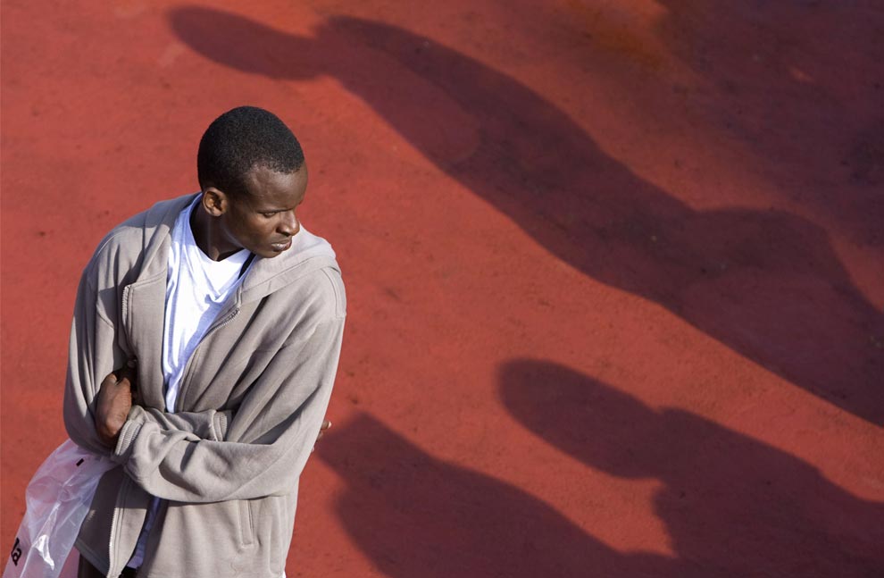 An immigrant casts a shadow on a Red Cross tent upon arriving at Arguineguin port in the Canary Islands of Gran Canaria early December 7, 2008. (REUTERS/Borja Suarez)