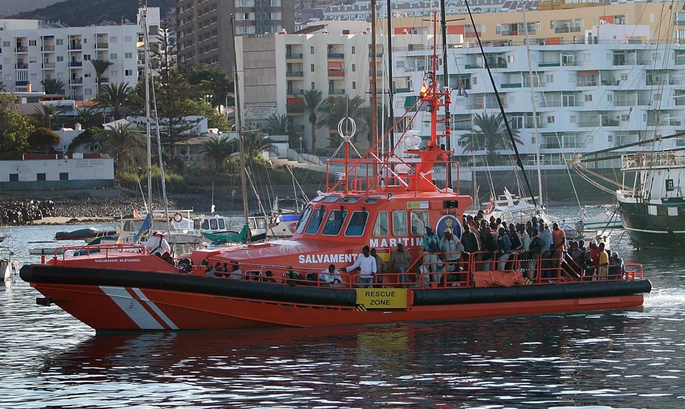 A rescue ship tows a boat carrying 76 migrants aboard in Arona, on the Spanish Canary Island of Tenerife, Thursday Nov. 6, 2008, after it the intercepted while crossing over from Africa. (AP Photo/EFE, Manuel Lerida)